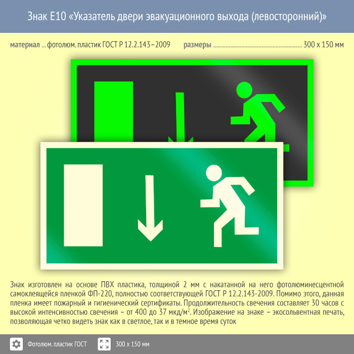 Знак E10 «Указатель двери эвакуационного выхода (левосторонний)» (фотолюминесцентный пластик ГОСТ 34428-2018, 300х150 мм) в Ставрополе купить