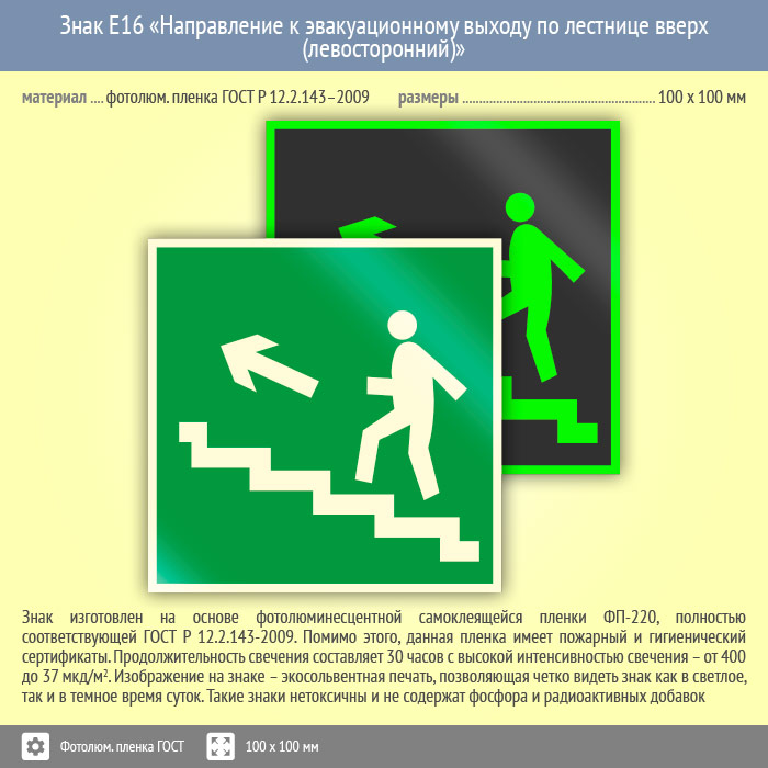 Знак E16 «Направление к эвакуационному выходу по лестнице вверх (левосторонний)» (фотолюминесцентная пленка ГОСТ 34428-2018, 100х100 мм) в Ставрополе купить