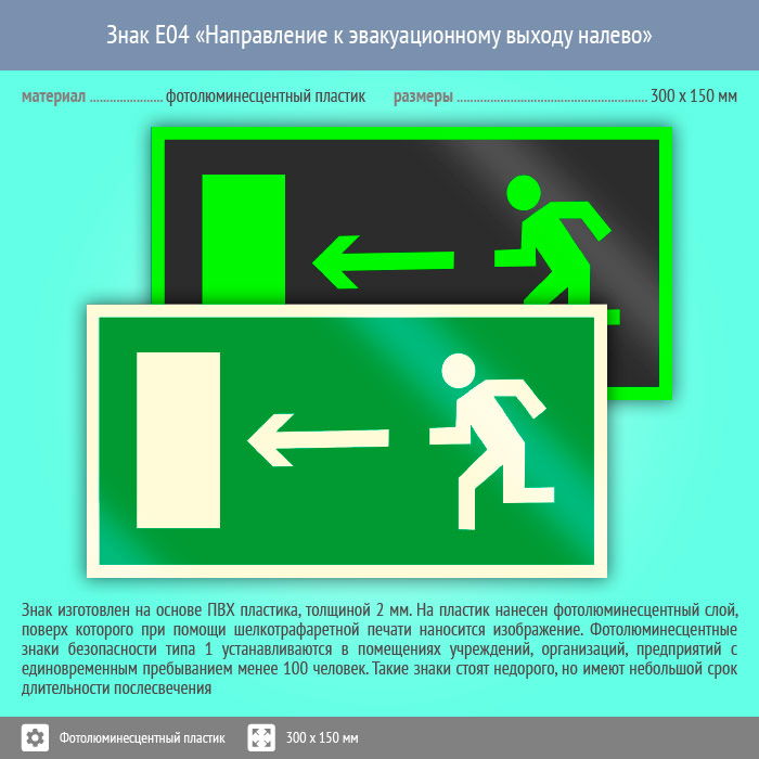 Знак E04 «Направление к эвакуационному выходу налево» (фотолюминесцентный пластик, 300х150 мм) в Ставрополе купить