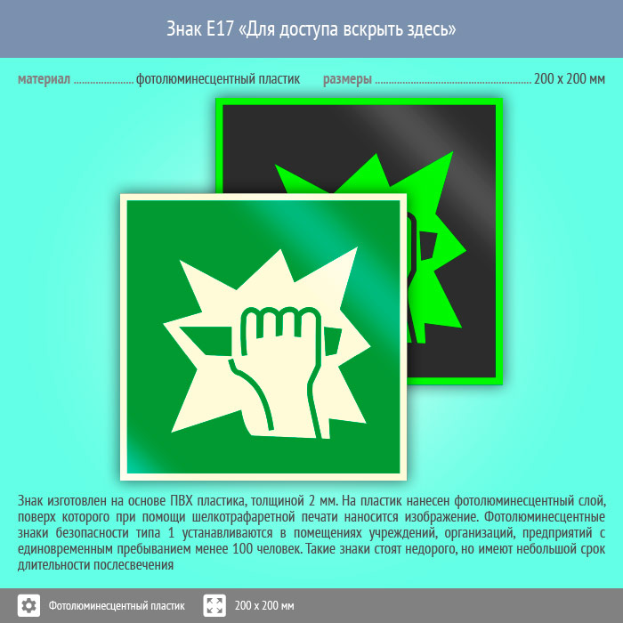 Знак E17 «Для доступа вскрыть здесь» (фотолюминесцентный пластик, 200х200 мм) в Ставрополе купить