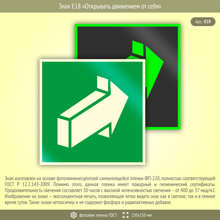 Знак E18 «Открывать движением от себя» (фотолюминесцентная пленка ГОСТ 34428-2018, 150х150 мм) в Ставрополе купить