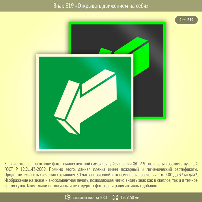 Знак E19 «Открывать движением на себя» (фотолюминесцентная пленка ГОСТ 34428-2018, 150х150 мм) в Ставрополе купить