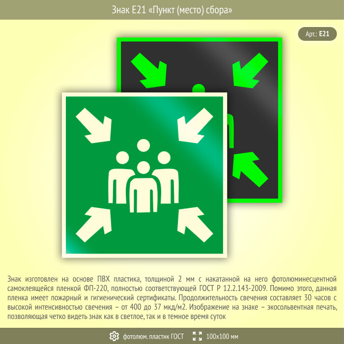 Знак E21 «Пункт (место) сбора» (фотолюминесцентный пластик ГОСТ 34428-2018, 100х100 мм) в Ставрополе купить
