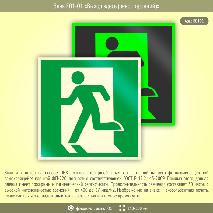 Знак E01-01 «Выход здесь (левосторонний)» (фотолюминесцентный пластик ГОСТ 34428-2018, 150х150 мм) в Ставрополе купить