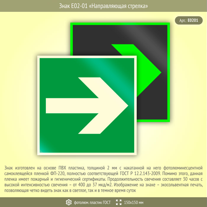 Знак E02-01 «Направляющая стрелка» (фотолюминесцентный пластик ГОСТ 34428-2018, 150х150 мм) в Ставрополе купить