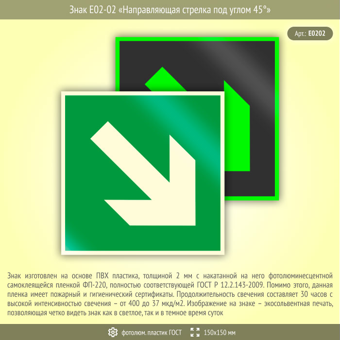 Знак E02-02 «Направляющая стрелка под углом 45°» (фотолюминесцентный пластик ГОСТ 34428-2018, 150х150 мм) в Ставрополе купить