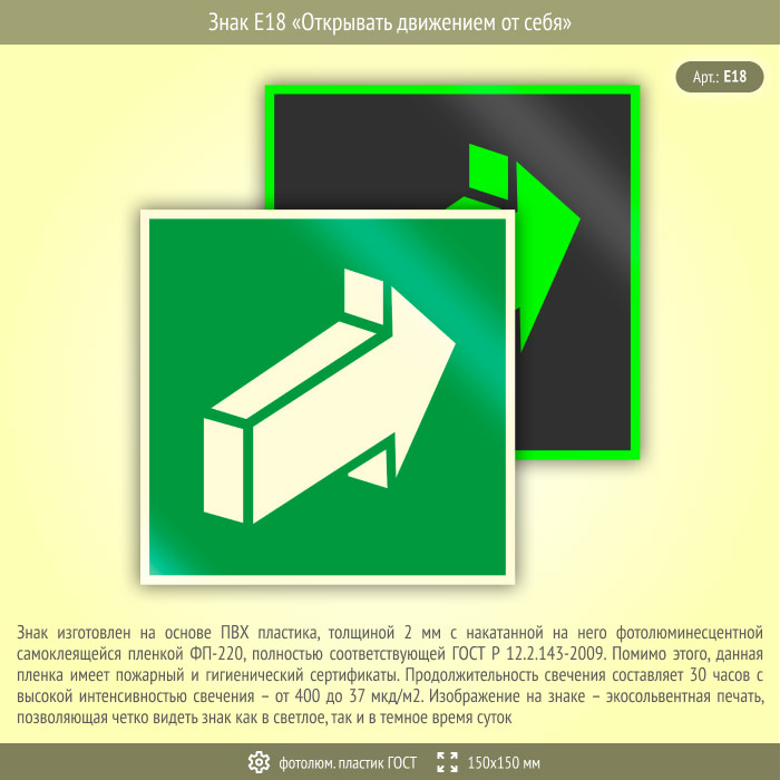 Знак E18 «Открывать движением от себя» (фотолюминесцентный пластик ГОСТ 34428-2018, 150х150 мм) в Ставрополе купить