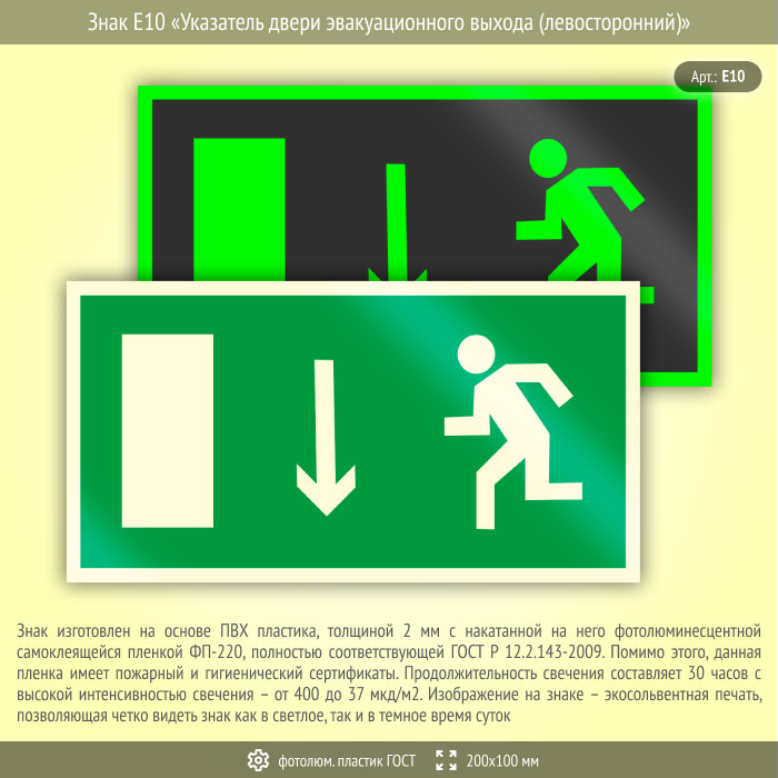 Знак E10 «Указатель двери эвакуационного выхода (левосторонний)» (фотолюминесцентный пластик ГОСТ 34428-2018, 200х100 мм) в Ставрополе купить