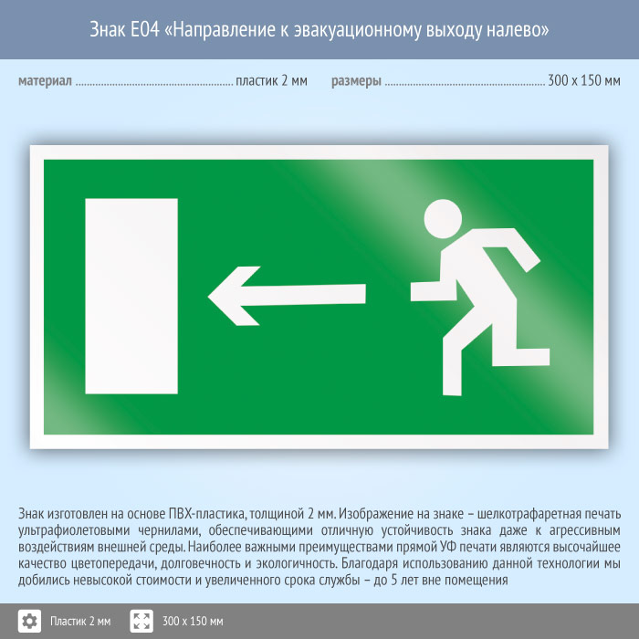 Знак E04 «Направление к эвакуационному выходу налево» (пластик, 300х150 мм) в Ставрополе купить