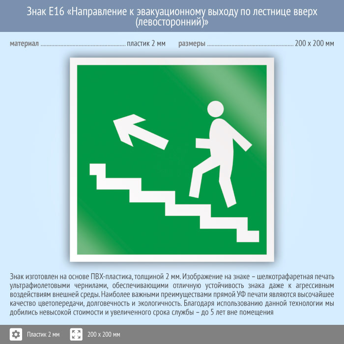 Знак E16 «Направление к эвакуационному выходу по лестнице вверх (левосторонний)» (пластик, 200х200 мм) в Ставрополе купить