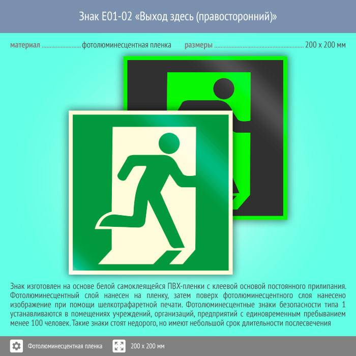 Знак E01-02 «Выход здесь (правосторонний)» (фотолюминесцентная пленка, 200х200 мм) в Ставрополе купить