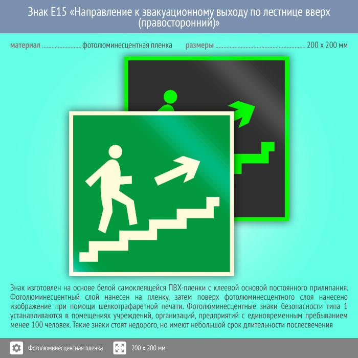 Знак E15 «Направление к эвакуационному выходу по лестнице вверх (правосторонний)» (фотолюминесцентная пленка, 200х200 мм) в Ставрополе купить