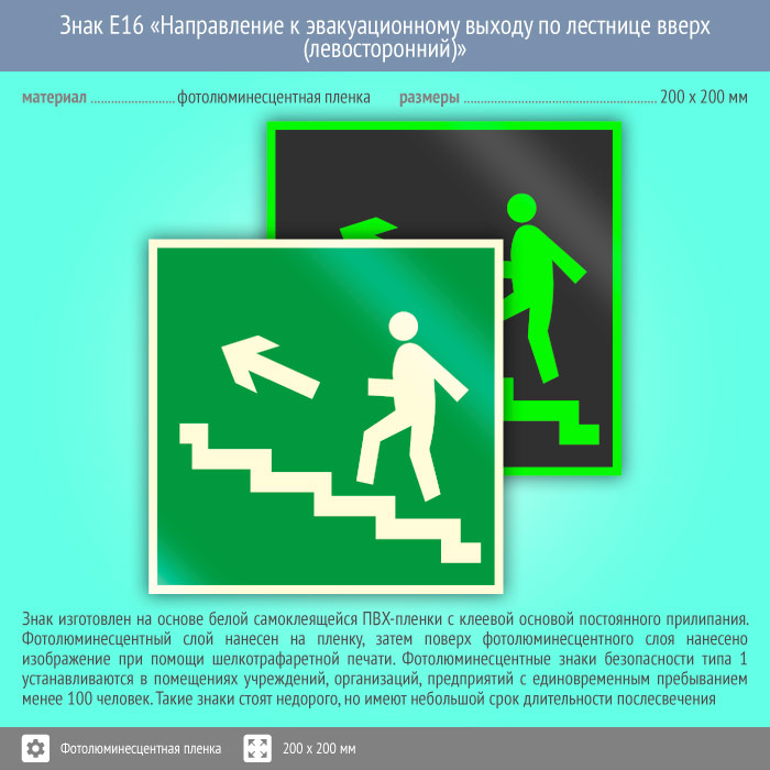 Знак E16 «Направление к эвакуационному выходу по лестнице вверх (левосторонний)» (фотолюминесцентная пленка, 200х200 мм) в Ставрополе купить