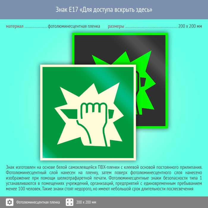 Знак E17 «Для доступа вскрыть здесь» (фотолюминесцентная пленка, 200х200 мм) в Ставрополе купить