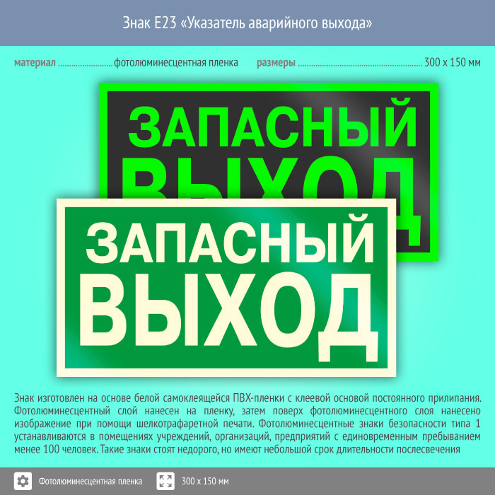 Знак E23 «Указатель запасного выхода» (устаревший) (фотолюминесцентная пленка, 300х150 мм) в Ставрополе купить