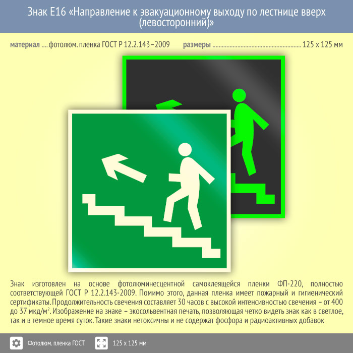 Знак E16 «Направление к эвакуационному выходу по лестнице вверх (левосторонний)» (фотолюминесцентная пленка ГОСТ 34428-2018, 125х125 мм) в Ставрополе купить