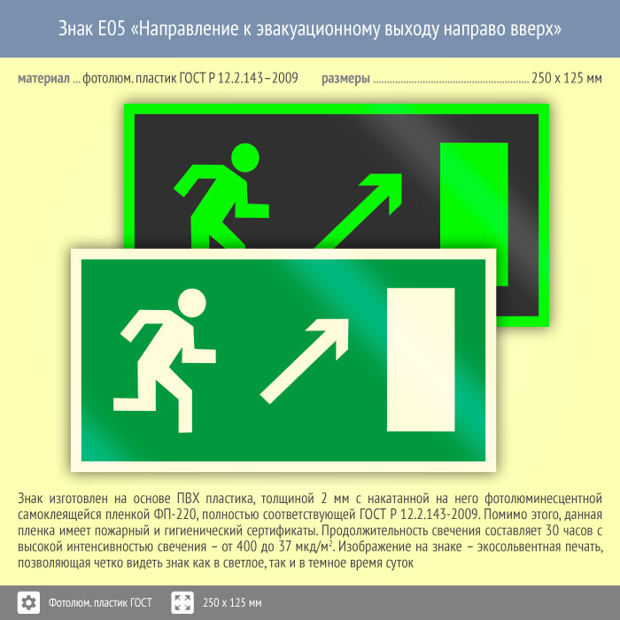 Знак E05 «Направление к эвакуационному выходу направо вверх» (фотолюминесцентный пластик ГОСТ 34428-2018, 250х125 мм) в Ставрополе купить