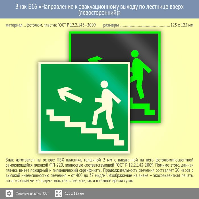Знак E16 «Направление к эвакуационному выходу по лестнице вверх (левосторонний)» (фотолюминесцентный пластик ГОСТ 34428-2018, 125х125 мм) в Ставрополе купить