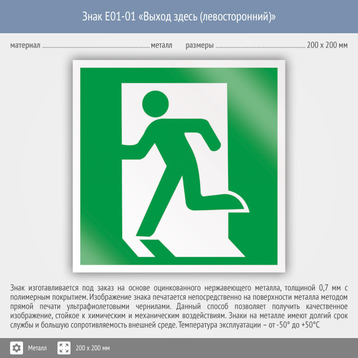 Знак E01-01 «Выход здесь (левосторонний)» (металл, 200х200 мм) в Ставрополе купить