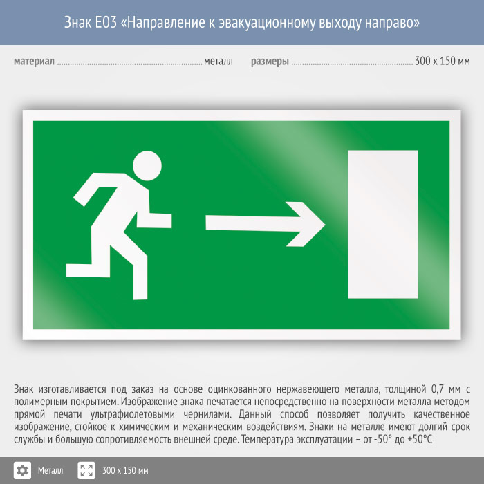 Знак E03 «Направление к эвакуационному выходу направо» (металл, 300х150 мм) в Ставрополе купить