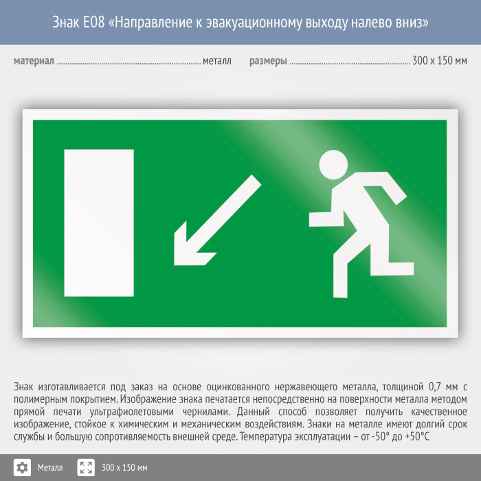 Знак E08 «Направление к эвакуационному выходу налево вниз» (металл, 300х150 мм) в Ставрополе купить