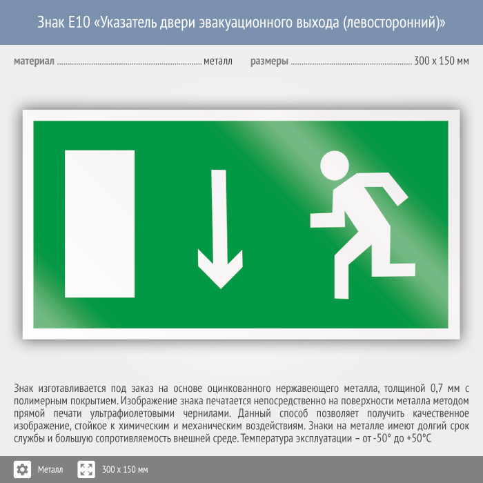 Знак E10 «Указатель двери эвакуационного выхода (левосторонний)» (металл, 300х150 мм) в Ставрополе купить