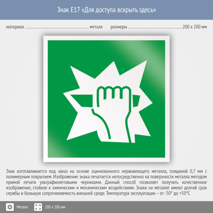 Знак E17 «Для доступа вскрыть здесь» (металл, 200х200 мм) в Ставрополе купить