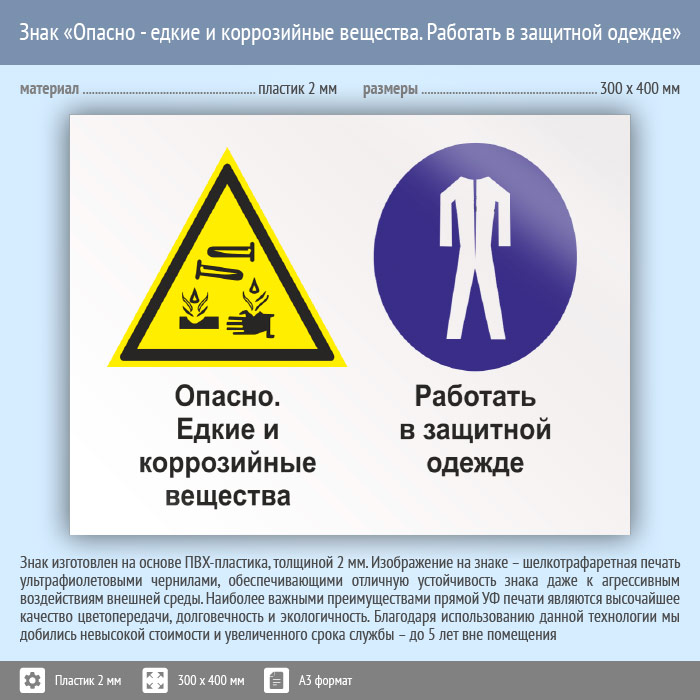 Знак «Опасно - едкие и коррозийные вещества. Работать в защитной одежде», КЗ-35 (пластик, 400х300 мм) в Ставрополе купить