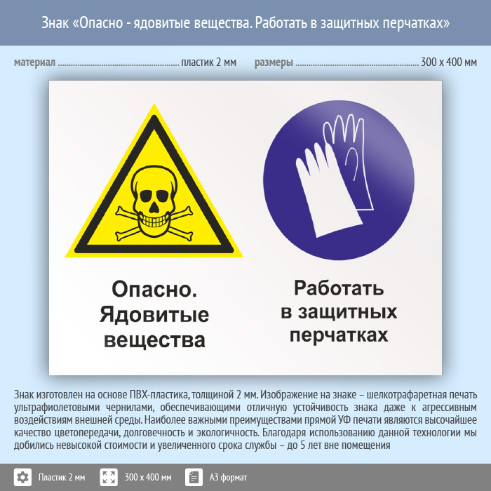 Знак «Опасно - ядовитые вещества. Работать в защитных перчатках», КЗ-43 (пластик, 400х300 мм) в Ставрополе купить