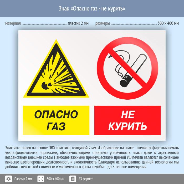 Знак «Опасно газ - не курить», КЗ-44 (пластик, 400х300 мм) в Ставрополе купить