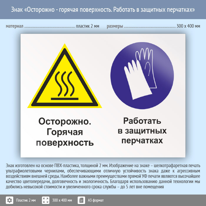 Знак «Осторожно - горячая поверхность. Работать в защитных перчатках», КЗ-55 (пластик, 400х300 мм) в Ставрополе купить