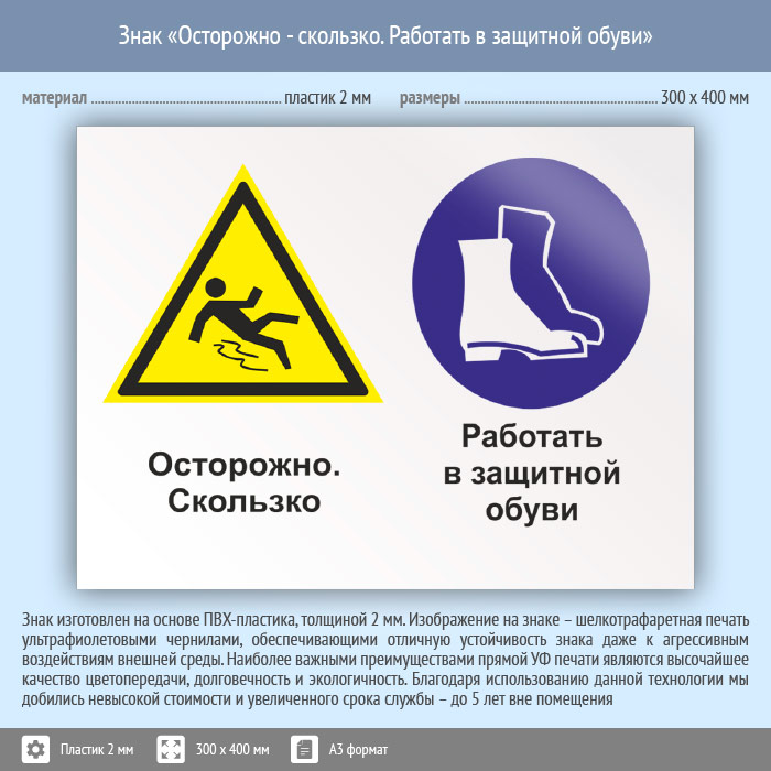 Знак «Осторожно - скользко. Работать в защитной обуви», КЗ-57 (пластик, 400х300 мм) в Ставрополе купить