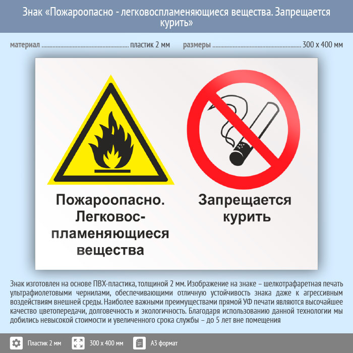 Знак «Пожароопасно - легковоспламеняющиеся вещества. Запрещается курить», КЗ-69 (пластик, 400х300 мм) в Ставрополе купить