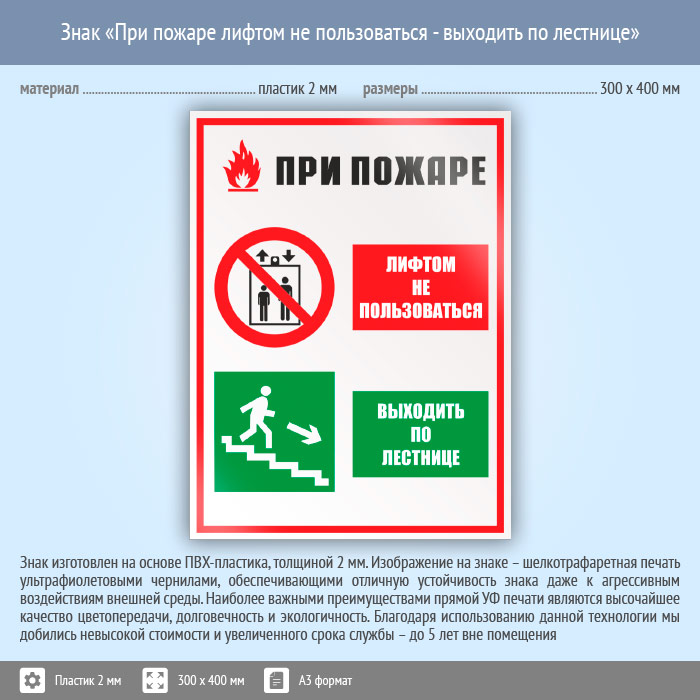 Знак «При пожаре лифтом не пользоваться - выходить по лестнице», КЗ-73 (пластик, 300х400 мм) в Ставрополе купить
