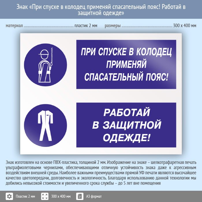 Знак «При спуске в колодец применяй спасательный пояс! Работай в защитной одежде», КЗ-76 (пластик, 400х300 мм) в Ставрополе купить