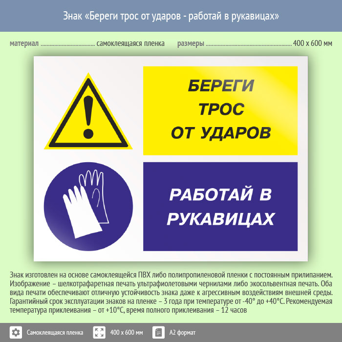 Знак «Береги трос от ударов - работай в рукавицах», КЗ-03 (пленка, 600х400 мм) в Ставрополе купить