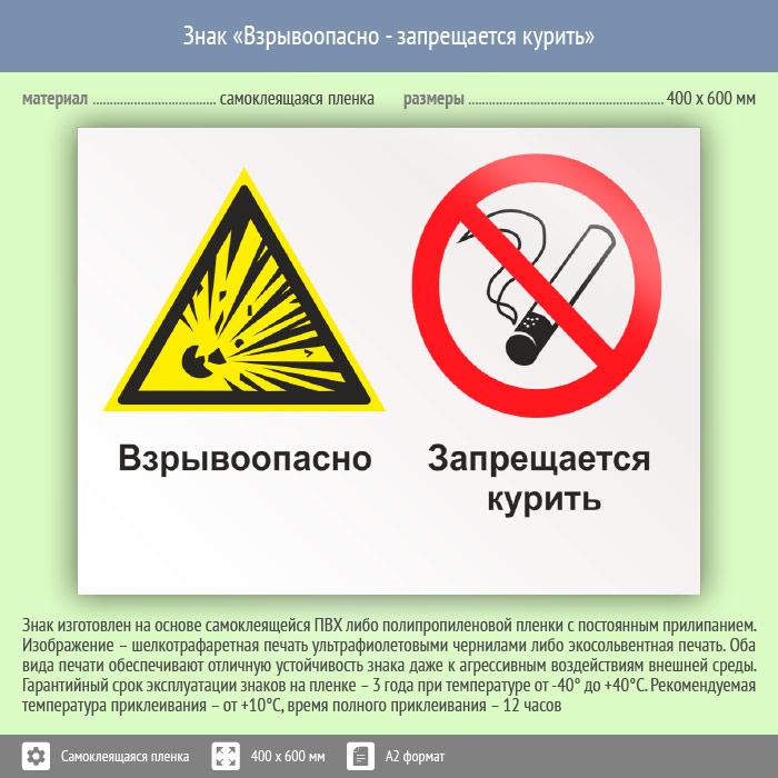 Знак «Взрывоопасно - запрещается курить», КЗ-06 (пленка, 600х400 мм) в Ставрополе купить