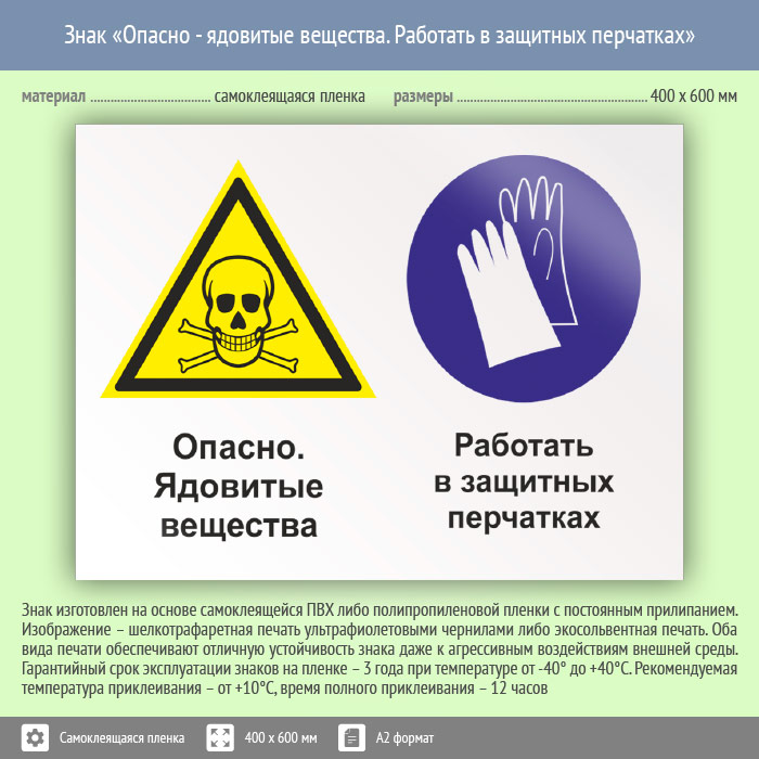 Знак «Опасно - ядовитые вещества. Работать в защитных перчатках», КЗ-43 (пленка, 600х400 мм) в Ставрополе купить