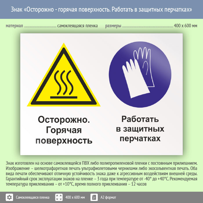Знак «Осторожно - горячая поверхность. Работать в защитных перчатках», КЗ-55 (пленка, 600х400 мм) в Ставрополе купить