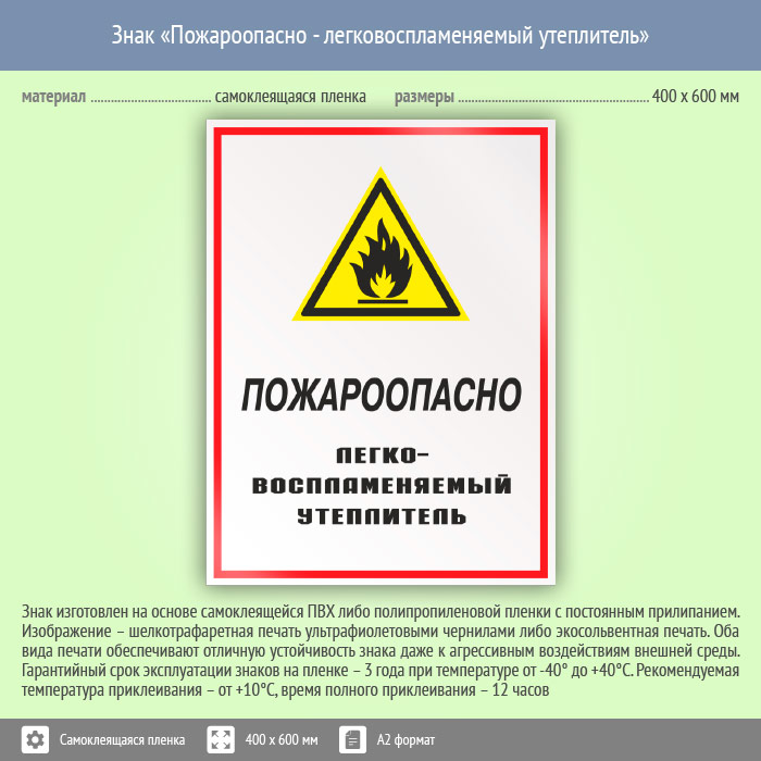 Знак «Пожароопасно - легковоспламеняемый утеплитель», КЗ-68 (пленка, 400х600 мм) в Ставрополе купить