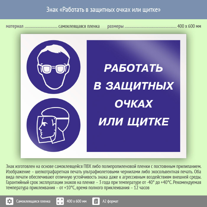 Знак «Работать в защитных очках или щитке», КЗ-80 (пленка, 600х400 мм) в Ставрополе купить
