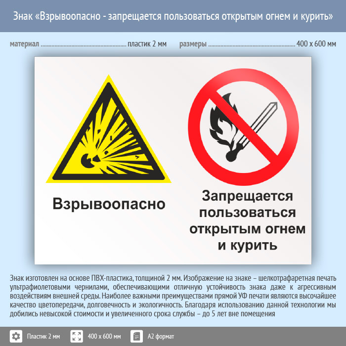 Знак «Взрывоопасно - запрещается пользоваться открытым огнем и курить», КЗ-07 (пластик, 600х400 мм) в Ставрополе купить