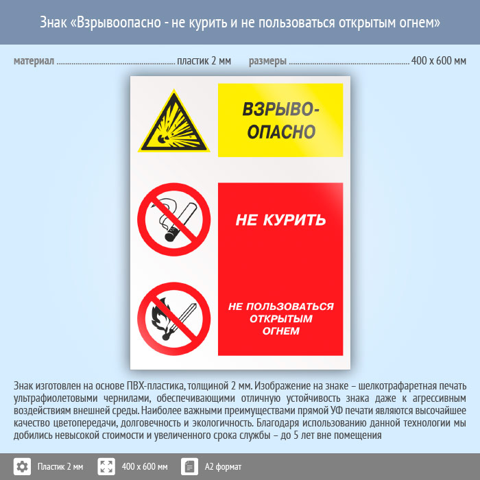 Знак «Взрывоопасно - не курить и не пользоваться открытым огнем», КЗ-08 (пластик, 400х600 мм) в Ставрополе купить