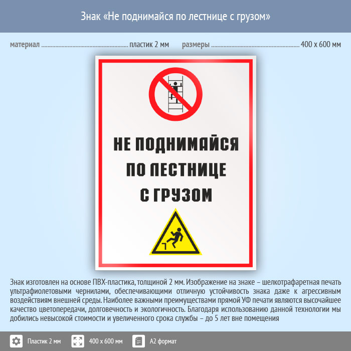 Знак «Не поднимайся по лестнице с грузом», КЗ-28 (пластик, 400х600 мм) в Ставрополе купить