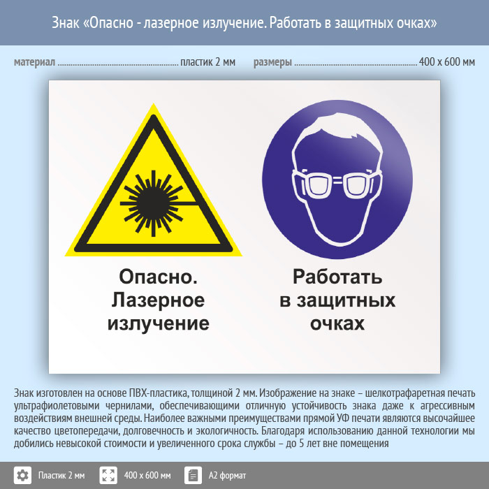 Знак «Опасно - лазерное излучение. Работать в защитных очках», КЗ-38 (пластик, 600х400 мм) в Ставрополе купить