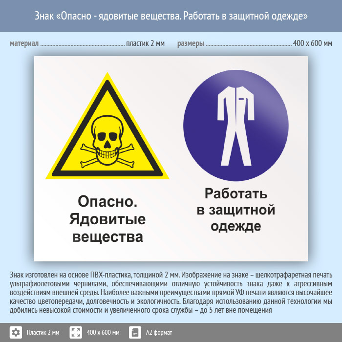 Знак «Опасно - ядовитые вещества. Работать в защитной одежде», КЗ-42 (пластик, 600х400 мм) в Ставрополе купить