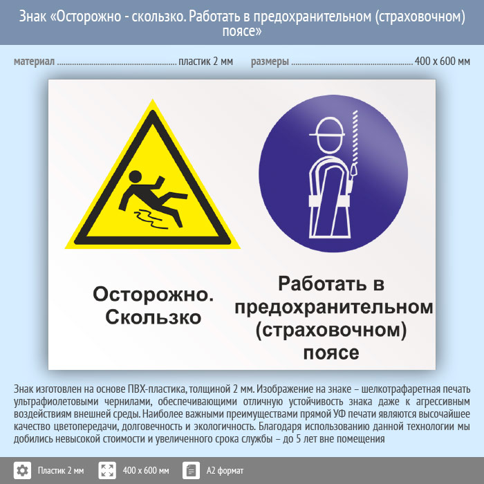Знак «Осторожно - скользко. Работать в предохранительном (страховочном) поясе», КЗ-58 (пластик, 600х400 мм) в Ставрополе купить