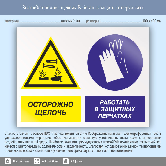 Знак «Осторожно - щелочь. Работать в защитных перчатках», КЗ-60 (пластик, 600х400 мм) в Ставрополе купить