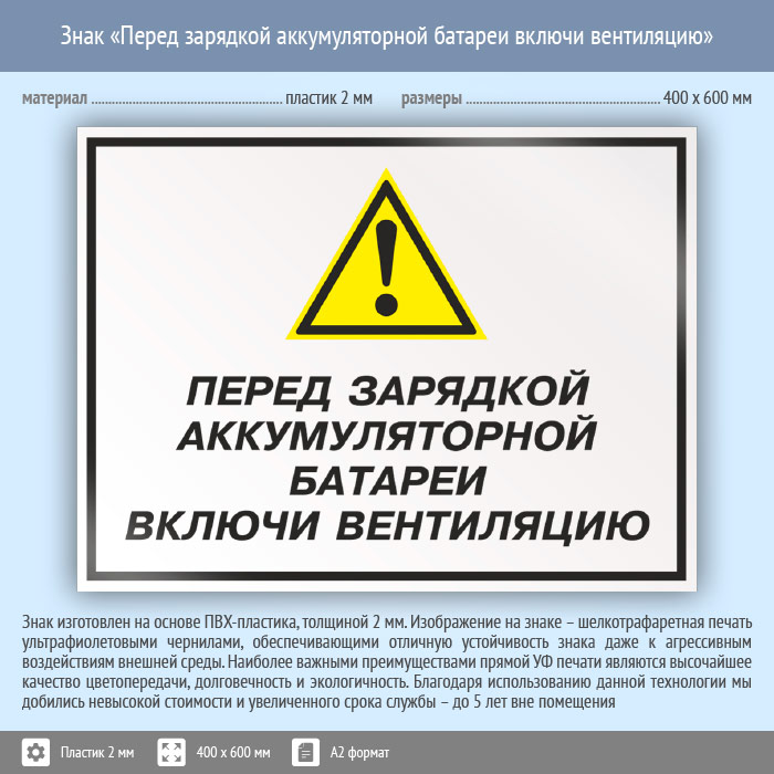 Знак «Перед зарядкой аккумуляторной батареи включи вентиляцию», КЗ-63 (пластик, 600х400 мм) в Ставрополе купить