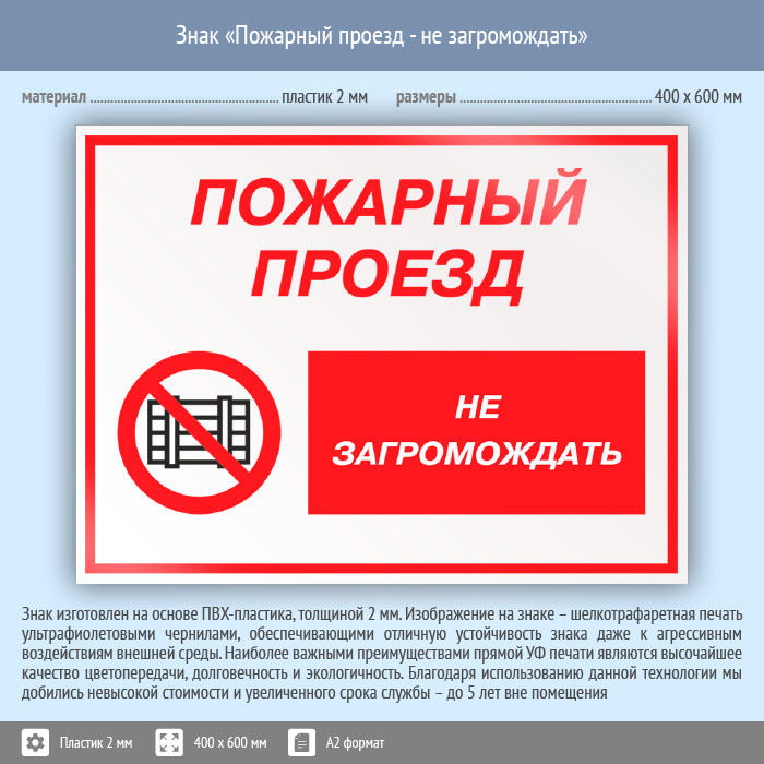 Знак «Пожарный проезд - не загромождать», КЗ-67 (пластик, 600х400 мм) в Ставрополе купить